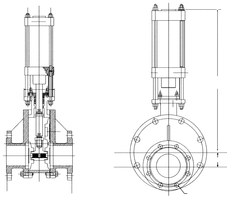 氣動出料閥設(shè)置于倉泵物料出口,倉泵輸送時,該閥打開,倉泵輸送結(jié)束時,該閥關(guān)閉。工作時,氣缸通過活塞桿帶動閥芯做往復(fù)運(yùn)動,從而來打開或關(guān)閉閥門。